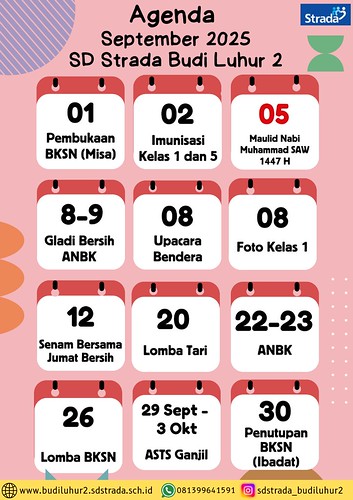 πΌβ¨ βBulan baru, semangat baru! Selamat datang September πΈ. Agenda kegiatan bulan ini sudah bisa dilihat di web SDBL2. Yuk, kita persiapkan diri dengan penuh semangat untuk mengikuti berbagai kegiatan seru dan bermanfaat yang sudah disiapkan. Jangan lupa ajak teman-teman untuk sama-sama melihat informasinya, supaya kita semua bisa ikut berpartisipasi dan tidak ada yang tertinggal. ππ Mari jadikan September ini penuh cerita indah di SD Budi Luhur II! π«πβ